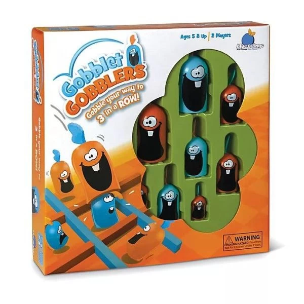 Alignez trois de vos Gobblers pour gagner ! Ces adorables petites créatures ne pensent qu’à s’amuser et gober d’autres Gobblers. Tactique, mémoire et bonne humeur : Un premier jeu de stratégie idéal