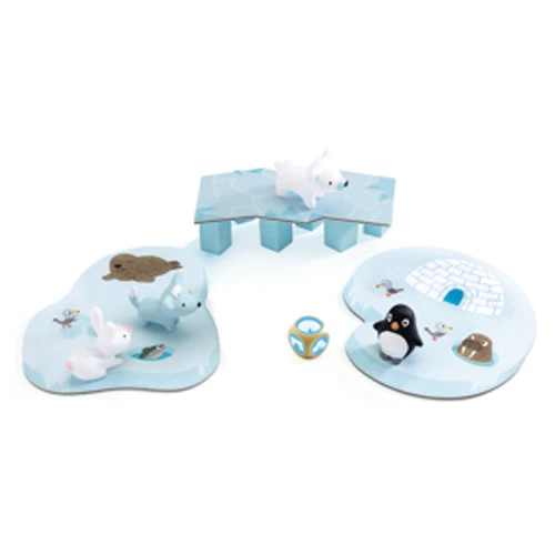 Un jeu de coopération spécialement conçu pour les tout-petits dès 2 ans ½. Sur la banquise, les 4 petits animaux tentent de regagner leur igloo. Pour gagner, il faut les aider à traverser le pont de glace avant que celui-ci ne s’écroule, en suivant les indications données par le dé. C’est gagné si tous les animaux sont sauvés !