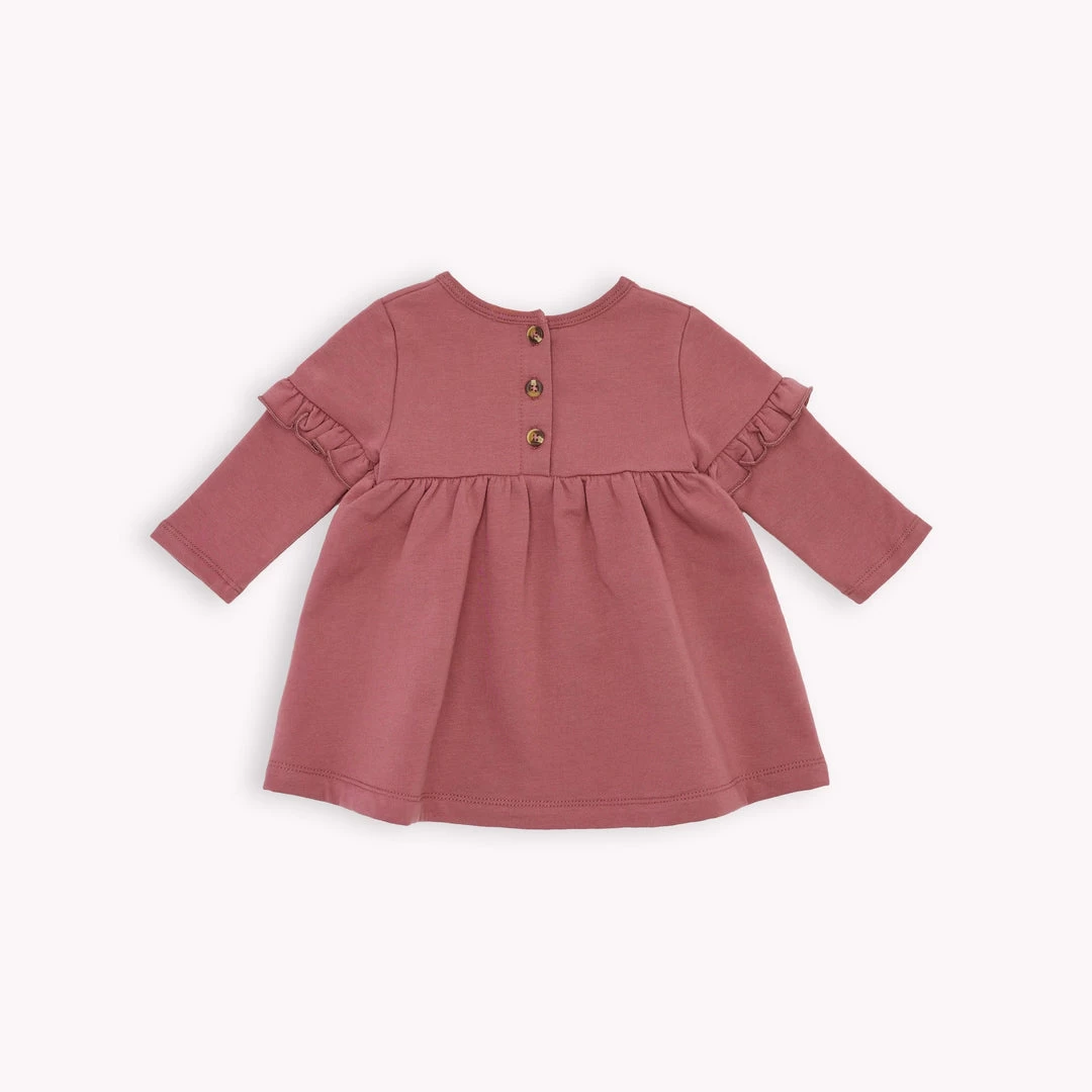 notre imprimé de canneberges. La robe épaisse est fabriquée en molleton de coton biologique pour la garder au chaud pendant la saison froide, tout en lui donnant un air à la fois amusant et féminin. Des froufrous sur les deux épaules ajoute une touche de coquetterie, tandis que la jupe à smocks est parfaite pour virevolter. Les boutons dans le dos facilitent l’habillage par-dessus la tête. Le legging est doté d’une bande de taille légèrement élastique qui permet de le relever et de l’abaisser rapidement.