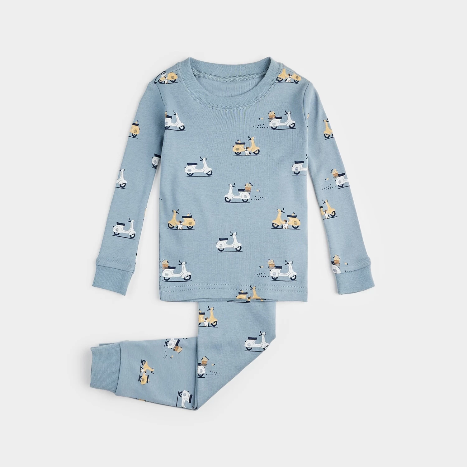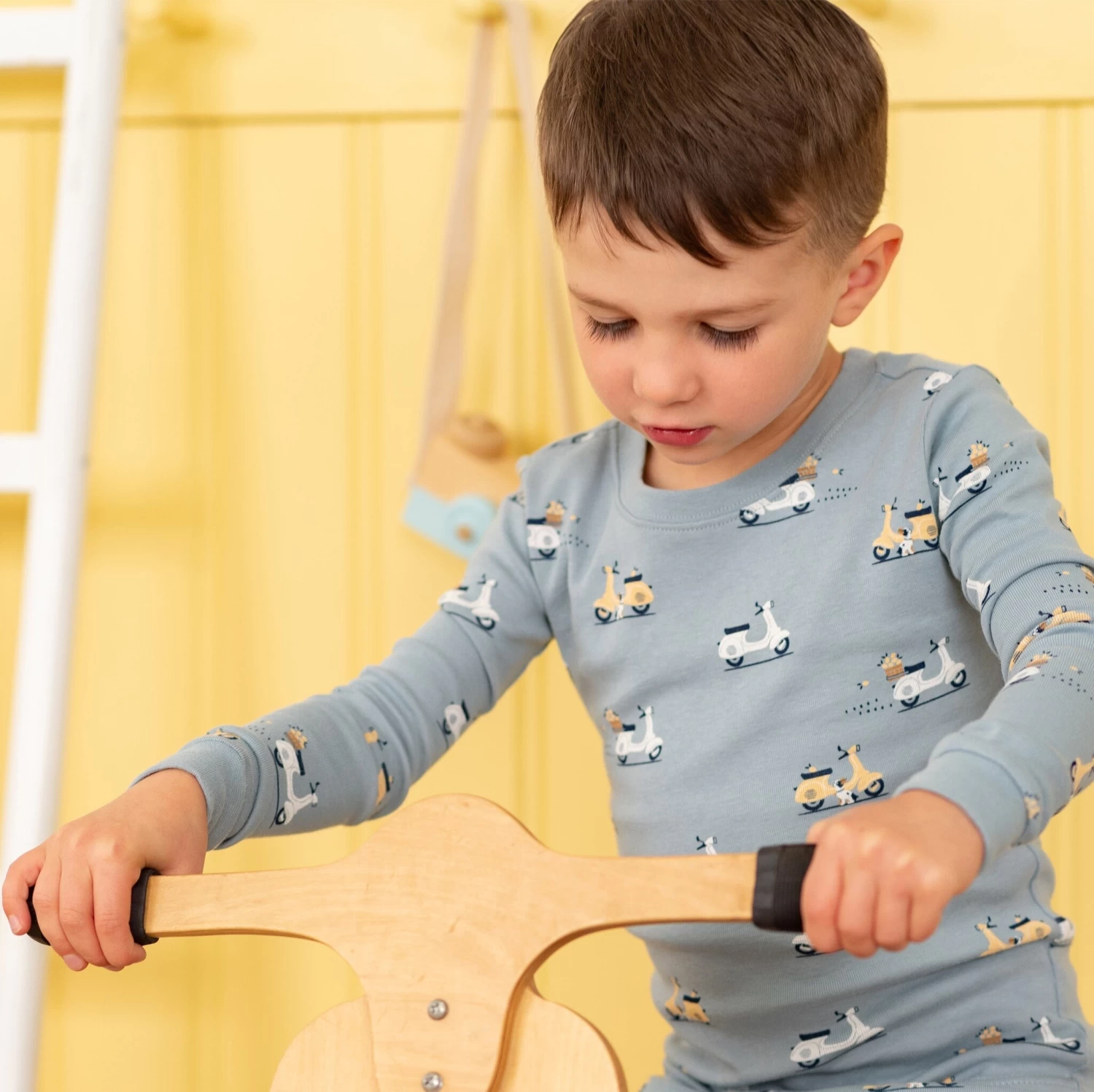 Cet ensemble pyjama à manches longues à imprimé motorinos est parfait pour s’assortir aux petits frères lors d’un dimanche de détente à regarder les courses. L’ensemble comprend un haut à manches longues et un pantalon assorti, tous deux dotés de bordures côtelées pour un ajustement parfait. Fabriqué en coton biologique côtelé, l’ensemble est douillet mais respirant, ce qui permet de maintenir les petits à la température idéale pendant qu’ils dorment. Des détails comme l’encolure arrondie et la bande de taille élastique ont été conçus pour rendre l’habillage rapide, facile et sans crises de larmes.