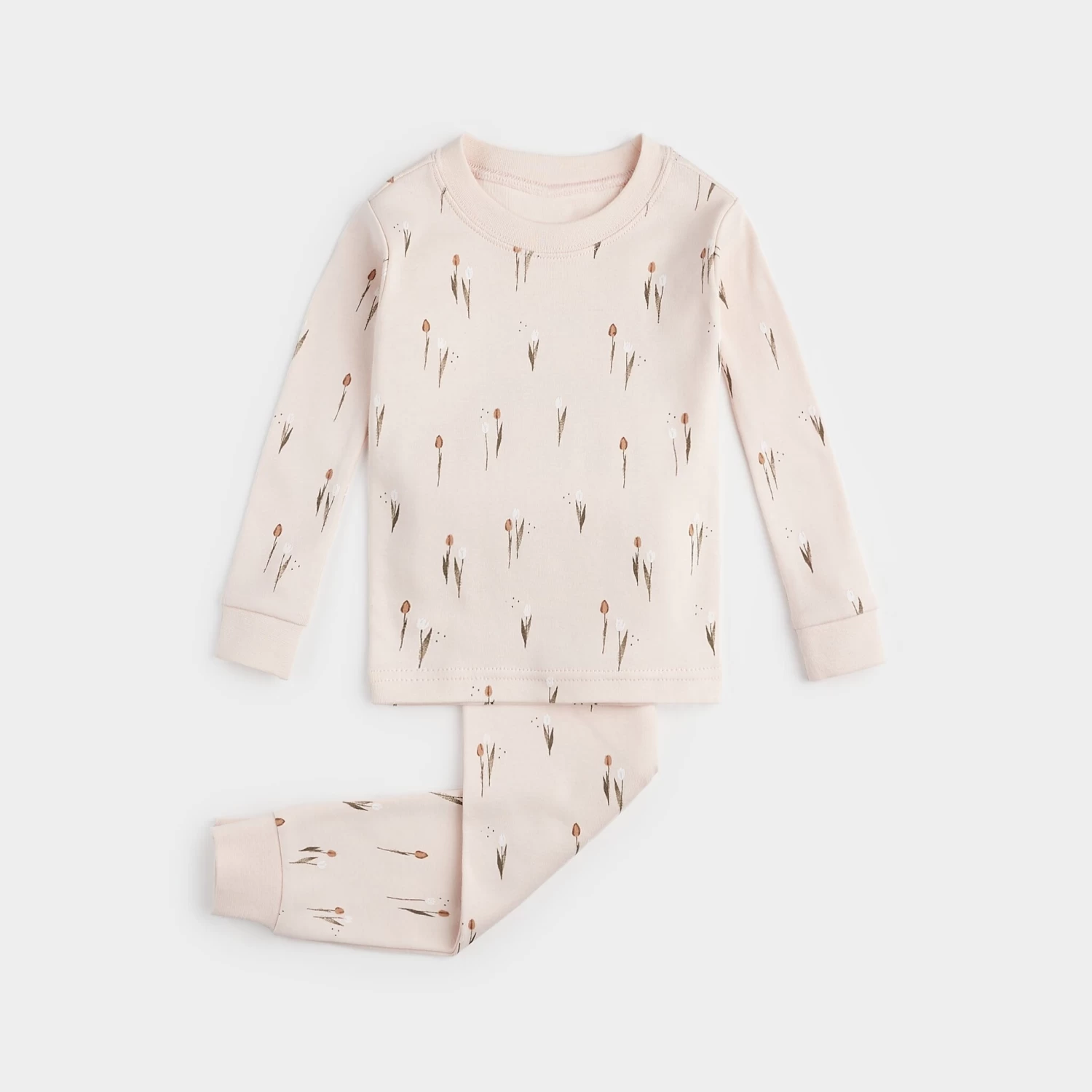 Ce joli pyjama rose est orné de notre imprimé de tulipes, parfait pour accueillir le printemps. L’ensemble deux pièces est fabriqué à partir de coton côtelé biologique léger et respirant, tout en étant douillet et chaud pour les nuits fraîches. Le haut à manches longues est doté de poignets côtelés et d’une encolure arrondie, tandis que le pantalon est muni d’une bande de taille élastique. Des dormeuses assorties sont disponibles pour les petites sœurs afin que toute la bande soit assortie