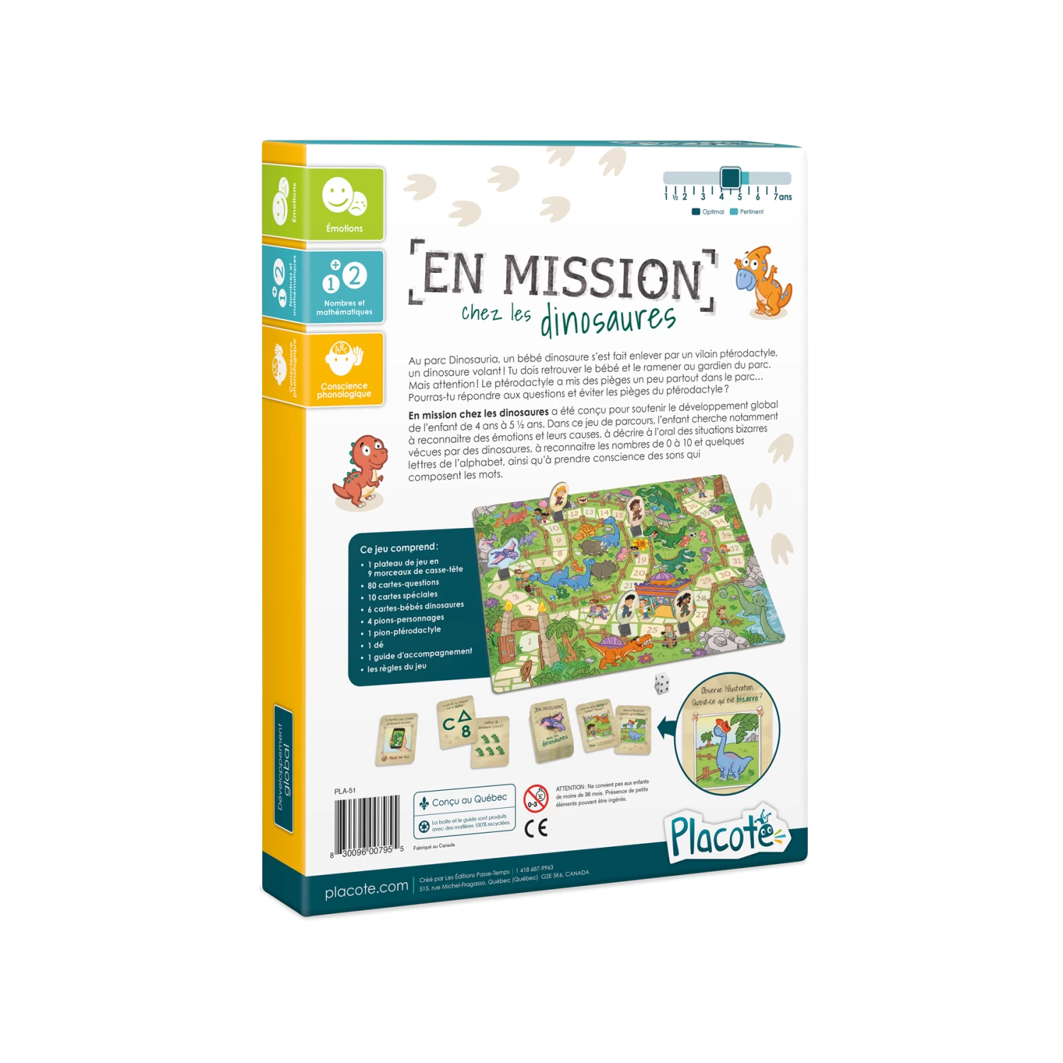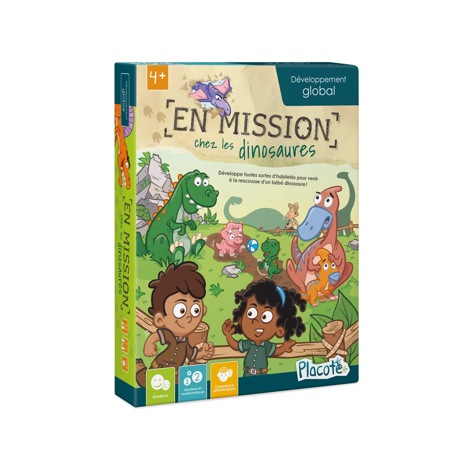 En mission chez les dinosaures a été conçu pour soutenir le développement global de l’enfant de 4 ans à 5½ ans. Dans ce jeu de parcours, l’enfant cherche notamment à reconnaitre des émotions et leurs causes, à décrire à l’oral des situations bizarres vécues par des dinosaures, à reconnaitre les nombres de 0 à 10 et quelques lettres de l’alphabet, ainsi qu’à prendre conscience des sons qui composent les mots.