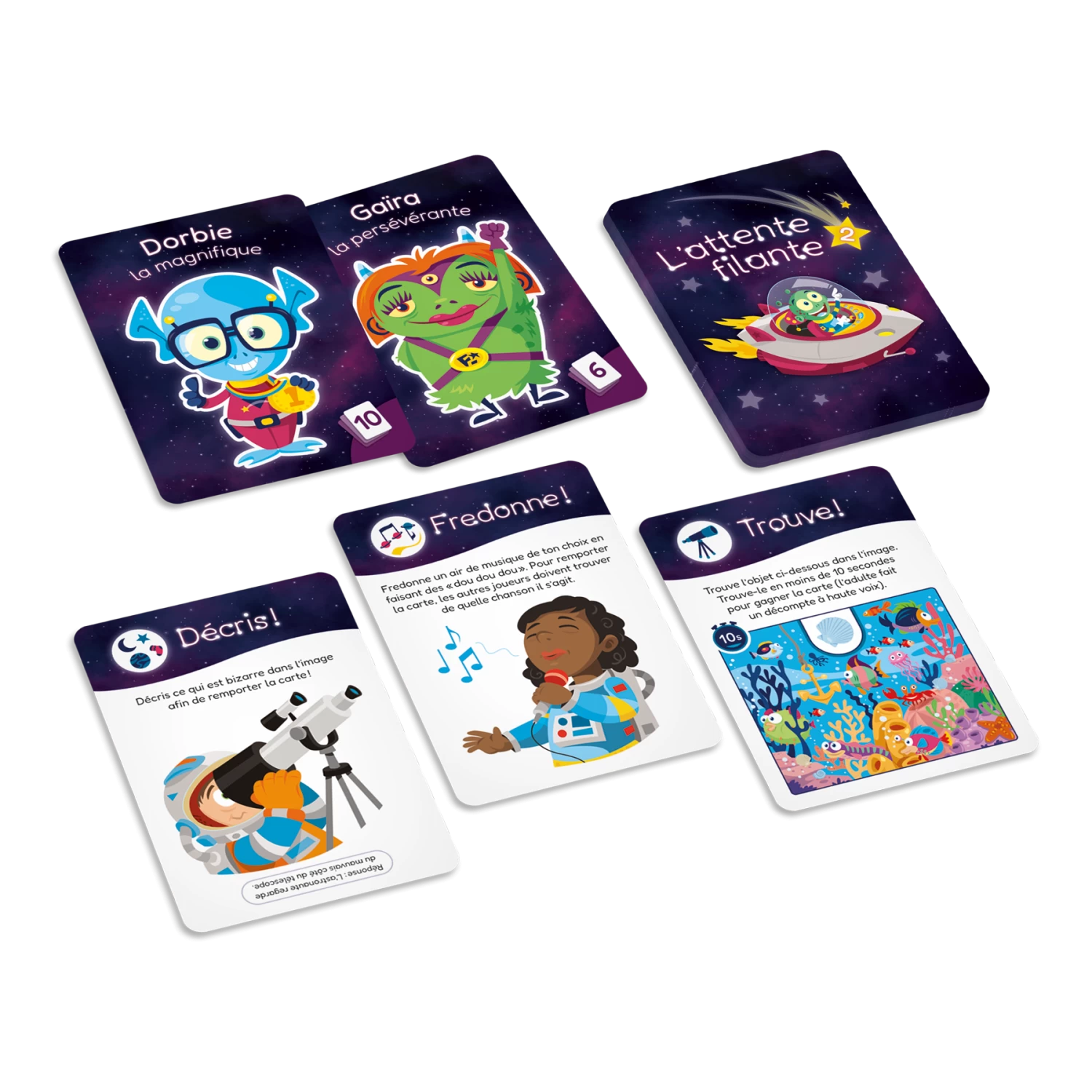 L’attente filante 2 est un jeu de cartes destiné aux enfants de 5 à 8 ans dans lequel les joueurs doivent réaliser toutes sortes de défis ludiques sollicitant des habiletés variées. Le jeu a été pensé pour transformer les situations d’attente en moments amusants!