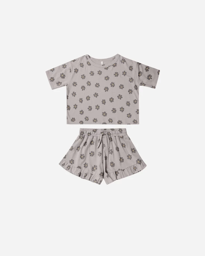 Cet ensemble est l’ensemble parfait pour les jours d’été! Il comprend le haut à épaules tombantes le plus doux et un short avec des volants à l’ourlet.